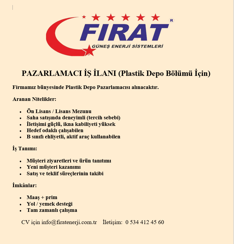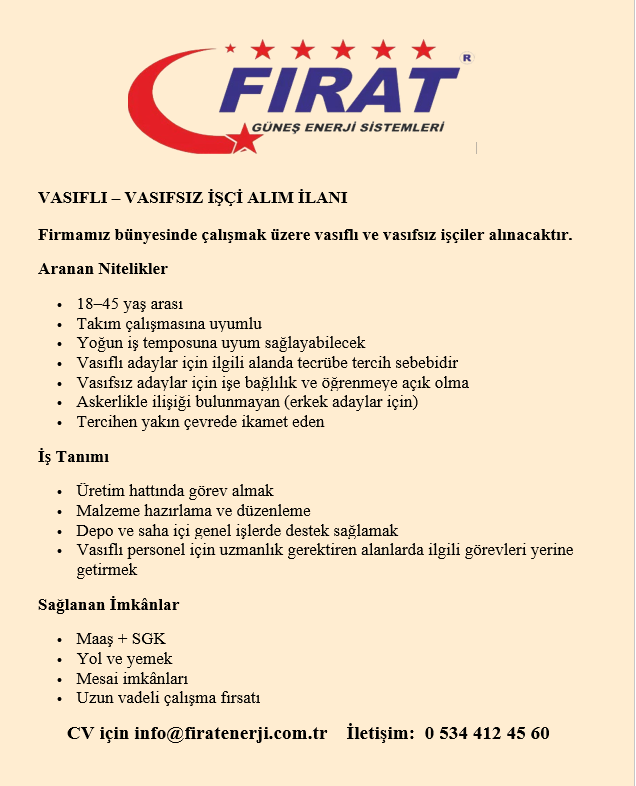 Fırat Enerji olarak, başarımızın arkasındaki en büyük gücün, kendini işine adamış, yetenekli ve vizyon sahibi ekibimiz olduğuna inanıyoruz. Hızla büyüyen Enerji dünyasında fark yaratmak için yola çıktık ve bu yolculukta bize katılacak yeni yol arkadaşları arıyoruz.